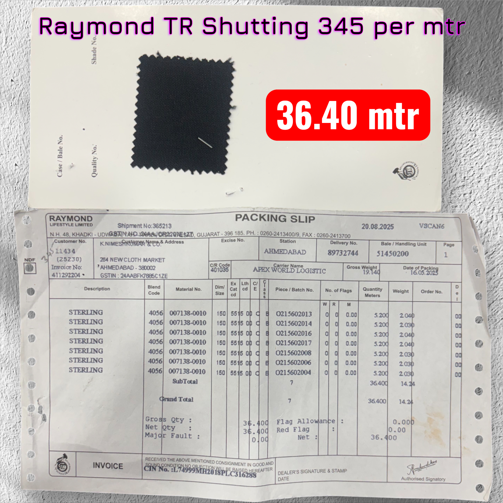 Raymond pure TR Suiting 345 per mtr Fabric is one of the finest fabric for luxurious Suiting for men.It is a Great Export Qualiy product.
